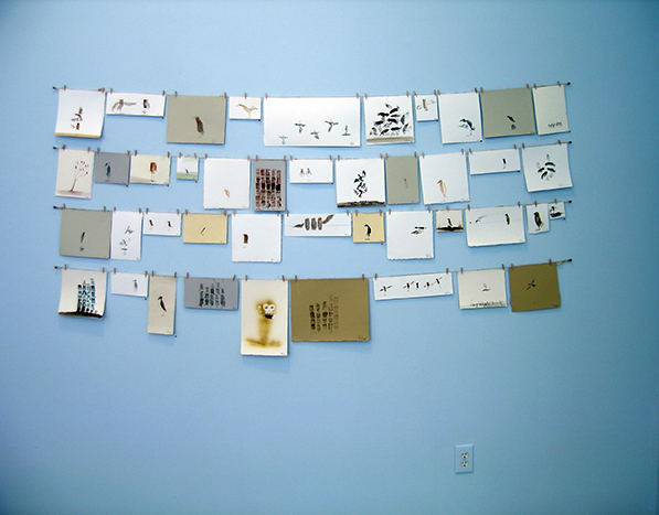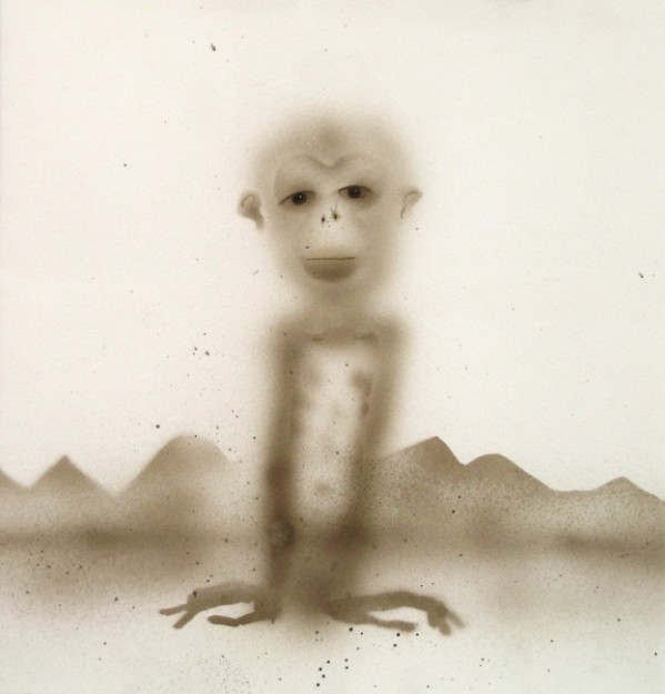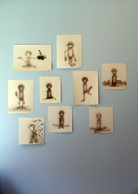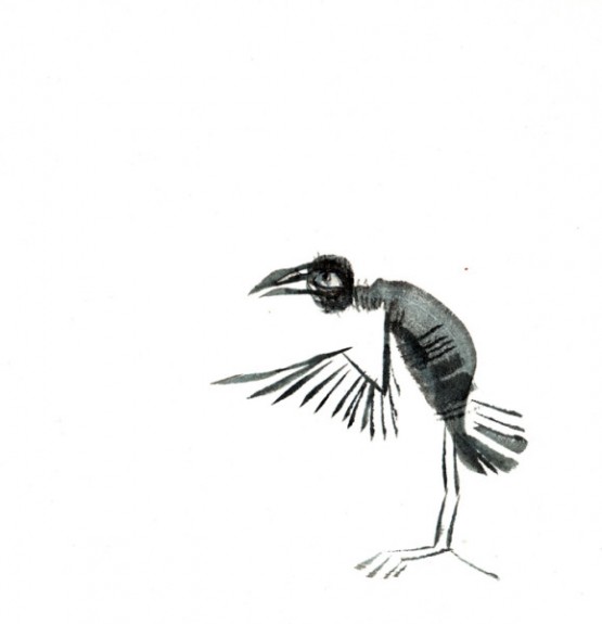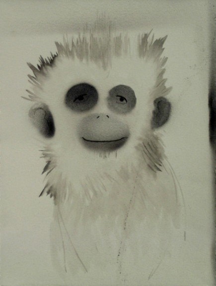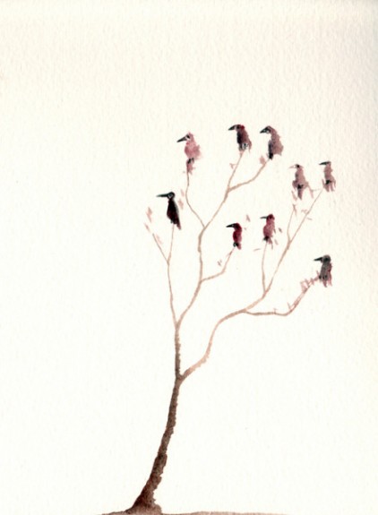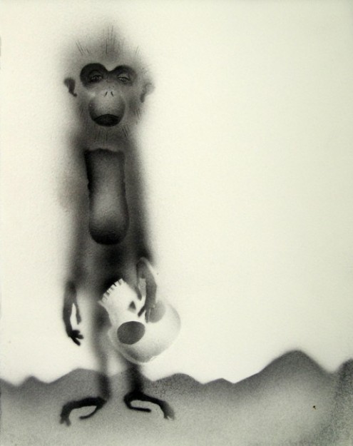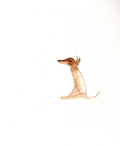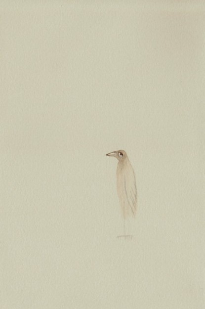 Jeff Cairns’ small-scale works are painted on scrap gathered at the lithograph shop he works at. His subjects are scraps too. Stray dogs, crows, birds–that often look more forlorn than free—the occasional skeleton and monkeys. Employing watercolor, or more rarely gouache, Cairns evokes these characters so sparely that he describes the work as drawings. The color palette is muted–grays, browns, blacks, an occasional aqua , or maybe when he’s going full bore a whole scrap painted in variations of a rich hopeful blue. But most often the creatures are left with no landscape, or very little. They themselves are bewildered, aliens in their own environment: the dogs crouched, often defensively, or positioned awkwardly, hesitating, often bemused. Where to now. Perplexed, quizzical they look out, leaving the viewer no choice but to look within, they’re remnants of cartoons that tell a novel. Even a flock of birds, each depicted differently, are lonely in their separateness.